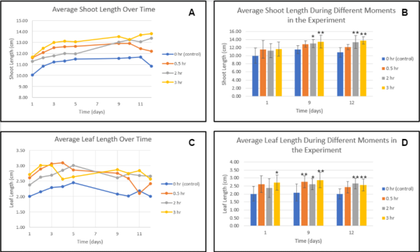 Several variables were measured throughout all trials. A standard, 12-inch transparent ruler was utilized for all length measurements, and a basic digital scale reading in grams and up to 1 decimal place was utilized for mass measurements. Measurements for Trial 1, Trial 2, and Trial 3 were taken at 10 AM-1 PM, 12-3 PM, and 1-3 PM respectively to avoid major diurnal variations within trials. Firstly, the average shoot length was recorded. This was done by measuring the length of all 40 plants (10 in each group). The length was considered as the distance from the bottom of the shoot outside of the soil to the highest point of the shoot. Then, the collected data were averaged by each group to obtain a mean value for each group. Additionally, the average leaf length was collected. All 40 plants’ leaves were measured. Leaf length was considered as the distance from the tip of the leaf to the base of the leaf connected to the stem. Only leaves that were above 2 cm were considered in order to not drag down data due to measuring newly formed leaves. These lengths were added and then divided by the total number of measured leaves of the plant, which was then averaged by each group to obtain a mean value for each group. Continuing, the average amount of leaves was observed. This was done by counting the number of leaves of all plants, and then averaging by each group to obtain a mean value for each group (in this case, newly formed leaves were also counted). Finally, average dry/wet mass as well as average water retention was collected. At the end of the experiment, the plants were removed from the soil and weighed on a precise scale, then averaged among each group to receive a mean value for each group (wet mass). Then, the plants were baked at 87 oC for 18 hours until all water was removed, and re-measured and averaged by each group to receive another mean value for each group (dry mass). Finally, the mean values for wet and dry mass were subtracted from each other to determine the average plant water retention for each group. All data was collected and calculated 4 days a week (except for average wet/dry mass and average plant water retention), excluding a few days where data could not be collected (like for example weekends or holidays).