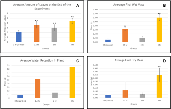 Several variables were analyzed throughout the experiment’s trials, beginning with the overall shoot and leaf length. This was done by averaging results by group to determine the average lengths for each group. Furthermore, the average amount of leaves for each plant has also been calculated, alongside the average leaf width. This was done by averaging data by group to determine the average amount of leaves per plant in each group. Average leaf width was determined by adding up all the collected data and then dividing by the total number of leaves in the group. Finally, the average final wet and dry mass was calculated. The average final wet mass was calculated by averaging data among each group to determine the final average wet mass. The final average dry mass was found by averaging data among each group, to determine the average final dry mass per plant in each group. In addition to these variables, online softwares were also used throughout data collection. One of these softwares was an Excel spreadsheet to store all of the data and track/discover trends. Excel v16.0 was utilized; the averages were calculated using the =AVERAGE formula and standard deviation was calculated using the =STDEV formula. This will allow all of the information and data to be more organized, accessible, and readily available. Furthermore, the patterns and trends were also transferred into graphs to help signify the relationships between pieces of data. These specific graphs were splatter-plot line graphs to show growth over time, like for shoot length, leaf length, and leaf amount. Additionally, bar graphs were used to show singular pieces of data (like dry/wet mass and water retention). Lastly, the ANOVA (one-way analysis of variation) software system, with post-hoc Tukey HSD (honest significant difference), will also be used to help keep track of the variance between variables and quantities (https://astatsa.com/OneWay_Anova_with_TukeyHSD/). The number of independent treatments was set to 4 (k=4), and the data metric for each individual plant was entered, separated by group. Values of significance were obtained solely from comparisons to control (A vs B; A vs C; A vs D) utilizing the calculated Tukey HSD p-values. Assumptions of normality and homogeneity of variance were met. The Tukey HSD test expounds the ANOVA values between multiple group values, and the ANOVA software is important in order to determine and calculate the variance between data points.
