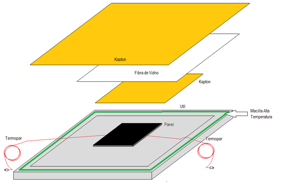 Para llevar a cabo el ciclo de estufa, se realiza una bolsa de vacío al laminado, utilizando materiales auxiliares de alta temperatura. La bolsa se realiza sobre un útil que lleva un agenta desmoldeante, el laminado, kapton como película separadora, fibra de vidrio como aireador y otra lámina de kapton y masilla para el cierre de la bolsa. En la figura 3 se muestra el esquema de bolsa de vacío y una imagen de una bolsa antes del ciclo de consolidación.