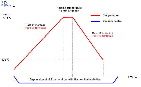 El proceso de laminación de los paneles se realiza con patrones unidos mediante puntos de soldadura y consolidados en estufa con un ciclo de temperatura y vacío, 2 h a 400ºC y -0.8 bares, con una velocidad de calentamiento y enfriamiento de 1 a 10ºC/min, según el esquema que se muestra en la figura 2.