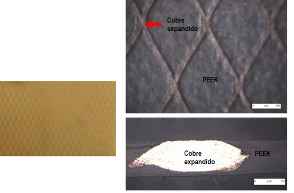 El la figura 5 se muestra una imagen real de cómo la lámina de cobre expandida queda cubierta por el PEEK.