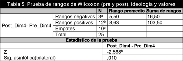 Para obtener evidencias de la progresión de los niveles de competencia mediática en la dimensión «Ideología y valores» relativa a los conocimientos, destrezas y actitudes relacionados con el análisis crítico de los medios, sus intenciones y cómo estos modulan la opinión y las identidades, se aplicó la misma prueba formulando las hipótesis correspondientes (Ho: No hay diferencias en la dimensión 4. Ha: Existen diferencias en la dimensión 4).