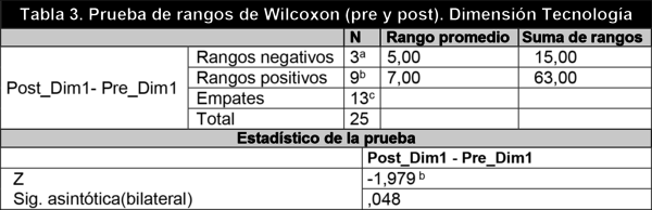 Para obtener evidencias de la progresión de los niveles de competencia en la dimensión «Tecnología», que se centra en los conocimientos, destrezas y actitudes relacionados con el manejo de las herramientas tecnológicas y comunicativas, se aplicó la misma prueba formulando las hipótesis correspondientes (Ho: No hay diferencias en la dimensión 1. Ha: Existen diferencias en la dimensión 1).