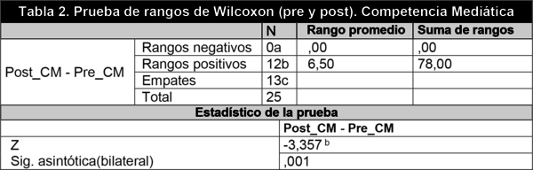 A fin de obtener evidencias de la progresión de los niveles de competencia mediática globalmente considerada del alumnado se aplicó la prueba de rangos con signo de Wilcoxon para muestras relacionadas teniendo en cuenta los resultados obtenidos en todas las dimensiones. Con el objetivo de conocer si el nivel global de competencia mediática del alumnado varió después de aplicar el programa de AMC se formularon las siguientes hipótesis: