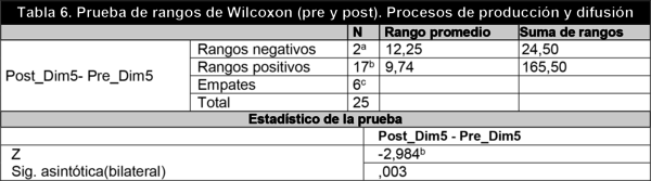 El resultado (sig=0,003<0,05) mostró diferencias en el nivel de competencia del alumnado antes y después de la aplicación del programa implicando una mejora en el nivel de competencia en la dimensión «Procesos de producción y difusión».