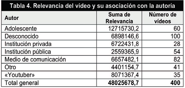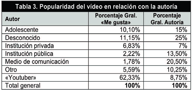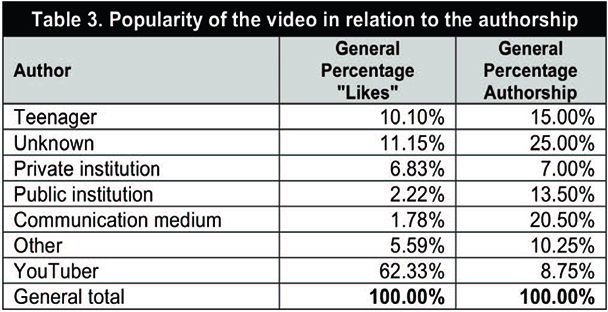 Según los resultados obtenidos, los vídeos de adolescentes, que suponen el 15% del total de piezas audiovisuales, solo suman el 10,1% de los «me gusta» detectados. Por su parte, aunque los vídeos realizados por «youtubers» representan únicamente el 8,75% del total, acaparan el 62,33% de los «me gusta». En el lado opuesto, los vídeos pertenecientes a medios de comunicación, que suponen el porcentaje con autoría reconocida más importante (20,5%) solo presentan el 1,78% de los «me gusta». En definitiva, se puede afirmar que son los vídeos de los «youtubers» los que generan una reacción muy positiva, de lo que se puede deducir una mayor capacidad de propiciar alguna reacción (posiblemente de formar un tipo de comunidad) y, en cierta medida, de conectar con los gustos y tendencias de la audiencia. Esto ocurriría en menor medida en el caso de los vídeos realizados por adolescentes, aunque con alguna incidencia reseñable.