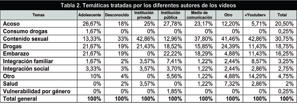 Uno de los elementos cruciales tiene que ver con los temas vinculados a la vulnerabilidad. En este sentido, en el 26,67% de vídeos de adolescentes abordan de una forma u otra el tema del acoso, que se nos presenta como el tema al que se presta mayor atención. A continuación, las drogas (21,67%) y el embarazo (21,67%) aparecen como problemáticas de calado para este colectivo. En cuarto lugar, sobresalen las piezas con contenido sexual (13,33%). El resto de aspectos no ofrecen cifras relevantes. En términos comparativos, cuando el autor del vídeo es un «youtuber», el contenido es fundamentalmente de naturaleza sexual (42,86%), seguido ya a mucha distancia por los relacionados con la droga o los embarazos (en ambos casos, 11,43%). También en los vídeos que proceden de los medios de comunicación lo sexual (37,80%) se estima como un tema más relevante. En segundo lugar, la audiencia puede acceder a vídeos que tratan la cuestión del acoso (23,17%), seguido de aquellos que reflejan algún aspecto del embarazo (18,29%).