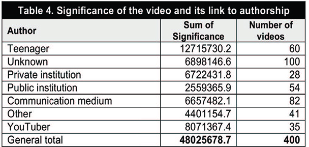 According to the results obtained, videos by teenagers, which represent 15% of the total number of audiovisual items, only account for 10.10% of the “likes” detected. As regards videos made by YouTubers, although these only represent 8.75% of the total number of videos, they have 62.33% of the “likes”. By contrast, the videos from the media, which constitute the highest percentage of videos with known authorship (20.50%), only account for 1.78% of “likes”. In short, it can be stated that videos by YouTubers generate a very positive reaction, from which it can be deduced there is a greater ability to get a reaction (possibly of forming some community) and, to a certain extent, to click with the tastes and trends of the audience. This would occur to a lesser extent in the case of videos made by teenagers, although there are some noteworthy results.