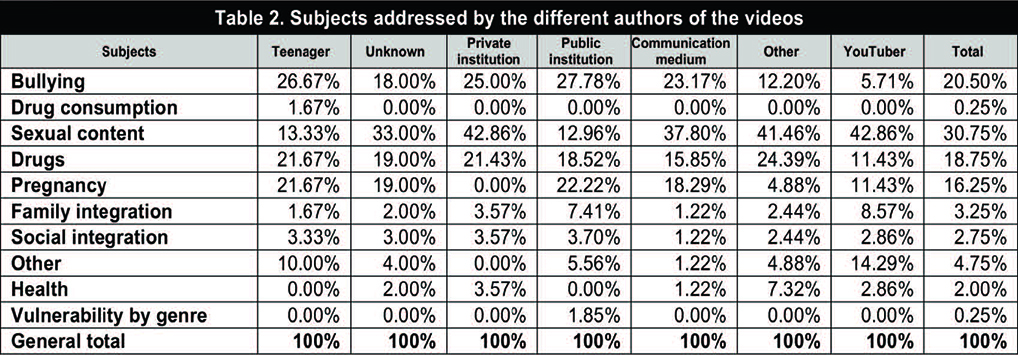One of the crucial elements has to do with issues linked to vulnerability. In this respect, 26.67% of the teenauthored videos tackle in one way or another the subject of bullying, which features as the issue paid the most attention. The next most important issues for this group are drugs (21.67%) and pregnancy (21.67%). Fourth place is taken by the videos containing sexual content (13.33%). No relevant figures were offered by the remaining aspects. In comparative terms, when the author of the video is a YouTuber, the content is fundamentally of sexual nature (42.86%), followed at some distance by content related to drugs or pregnancies (in both cases, 11.43%). Sexual content (37.80%) is also deemed a more prominent subject in videos from the media. In the second place, the audience can access media-made videos that address the question of bullying (23.17%), followed by those that reflect some aspect of pregnancy (18.29%).