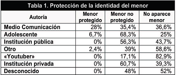 En este estudio también se ha analizado cómo aparecen los menores, aunque se ha de tener en cuenta que, en determinados tramos de edad, resulta complejo encajar el posible año de nacimiento de las personas que aparecen en las piezas audiovisuales. En este caso, se puede observar que en los vídeos planteados por los adolescentes es donde menos se protege (68,3%) la identidad del menor. También destaca el hecho de que tanto en las instituciones privadas como en las de naturaleza pública sea alto el porcentaje de documentos en los que es posible ver menores no protegidos (60,7% y 56,3% respectivamente). Frente a esto, los vídeos que proceden de medios de comunicación son los que, en mayor medida (28%), respetan la protección de la identidad del menor (es decir, se utiliza alguna técnica para que no sean reconocidos, ya sea, mediante sombras o a través de la distorsión o el pixelado de las imágenes), aunque presenten en un porcentaje mayor (35,4%) a menores no protegidos.