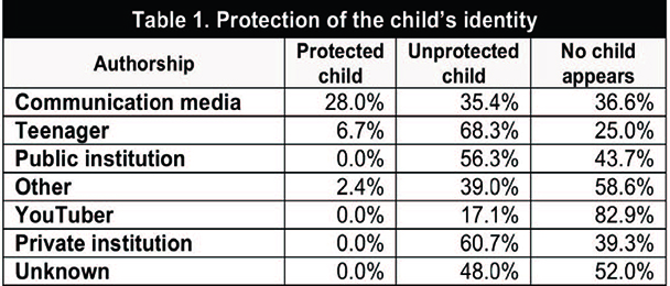 In this study, an analysis has also been made of how children appear, although it has to be borne in mind that in certain age groups it is difficult to determine the possible year of birth of the people appearing in the audiovisual content. In this case, it can be observed that it is in the videos authored by teenagers where their identities are least protected (68.3%). It also highlights the fact that in both private and public institutions there is a high percentage of documents in which it is possible to see children whose identities have not been protected (60.7% and 56.3%, respectively). In contrast, videos from the media are those that, to a greater extent (28%), respect protection of the children’s identities (that is, a technique is used to prevent them from being recognised, either by using shadow or by distorting or pixelating the images). However, they contain a higher percentage (35.4%) of forbidden for children.