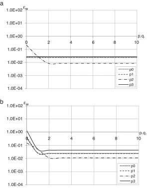 Analisou‐se o problema recorrendo a 2 esquemas de integração distintos, a integração nodal, p . q . =0, e a integração utilizando pontos de quadratura de Gauss (secção 2.2), p . q . = k , sendo k o número de pontos de quadratura por partição de célula de integração.