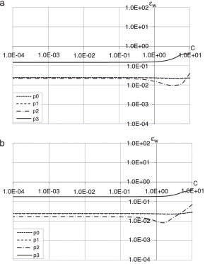Fez‐se variar os valores do parâmetro c entre 0,0001 e 10,0001 e estudou‐se a variação do erro médio do deslocamento vertical ( ) para a viga em questão (malha regular e malha irregular), considerando diferentes bases polinomiais – ausência de base polinomial (p0 ), base polinomial constante (p1 ), linear (p2 ) e quadrática (p3 ).