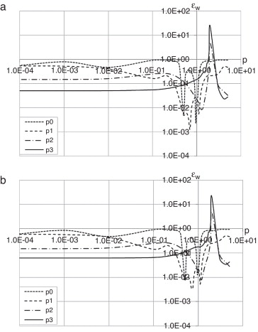 Figura 7. Erro do valor do deslocamento para a malha regular (a) e irregular (b), com a variação do parâmetro p, para células de influência segundo grau. |
