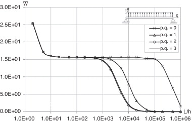onde q0 = 1N /m . Para o caso da carga uniformemente distribuída q = q0 , já para a carga pontual Q = q0 · L . Os resultados normalizados obtidos pelo NNRPIM são comparados com a solução analítica [29] . Os resultados obtidos encontram‐se nas Figura 21 , Figura 22 and Figura 23 para as vigas laminadas a 0°, 90° e 0°/90°/90°/0°, respetivamente. Na tabela 5 é apresentada uma comparação entre algumas das soluções obtidas com o NNRPIM e soluções disponíveis na literatura obtidas por outros autores.