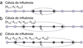 Figura 2. (a) Célula de influência de primeiro grau; (b) célula de influência de segundo grau; (c) célula de influência de terceiro grau. |