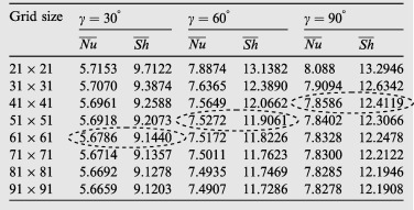 To decide the suitable grid size for the trapezoidal enclosure studied in this paper, numerical solutions are done for different grid sizes from 21 × 21 to 91 × 91 for three different inclination angles and . Table 1 indicates optimal grid sizes for three different inclination angles . As it is seen from the table a further refinement of grids from 41 × 41, 51 × 51 and 61 × 61 for , , and respectively, to 91 × 91 does not exert a significant effect on the results in terms of the average Nusselt and Sherwood numbers. As a consequence, a uniform grid of 61 × 61 points is sufficiently proper to ensure a grid independent solution for all of the angles in this work.