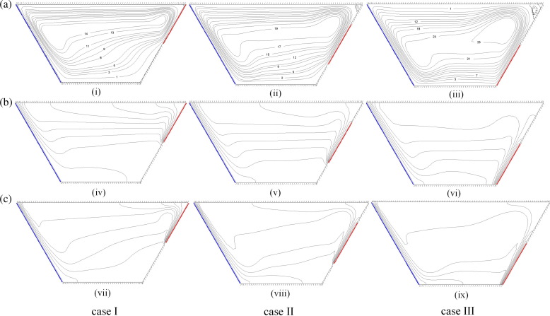 Fig. 4(i)–(iii) shows the flow patterns inside the enclosure for three different cases. It is observed that the flow is impelled upward by the active heated right sidewall and then downward by the cold left inclined wall. This leads to the appearance of the principal cell in the counterclockwise rotation direction that occupies the whole enclosure seen in all cases considered. In the first case, when the heating zone is placed on the top of the right sidewall (Fig. 4(i)), most of the fluid moves around the top part of the enclosure and the circulation is stronger due to the existence of a partially heated wall and the remaining parts are less activated due to the adiabatic walls. In this case, the flow is too weak with . It is seen that when the heating zone moves to the middle of the right sidewall, the strength of the flow is intensified, Fig. 4(ii). In the last case, where the heating zone is located on the bottom, the flow gets enough free space paths for circulation before meeting top adiabatic boundary and therefore, it accelerates and occupies the whole enclosure. The flow is further grown in strength and the velocity, and circulation rate is higher compared with other cases with .