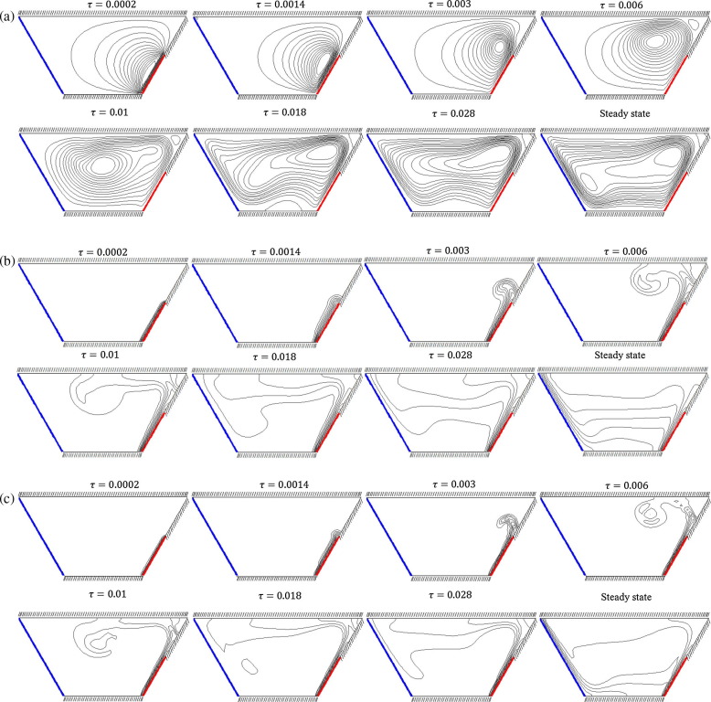 In the first subsection, the time development of fluid motion, temperature, and concentration distribution across the trapezoidal enclosure is analyzed. According to the initial condition at , the fluid contained in the enclosure is at and and consequently does not produce heat and mass inside the cavity. It is worth recalling that for , the temperature of the right partially active sidewall is changed to and that of the left sidewall remains at . While the left wall is still maintained at low concentration, the right partially heated active wall has higher concentration, . Because the right side wall is partially imposed to a higher temperature than that of the fluid, the fluid particles near the heated active sidewall become hot and their temperature increases. In the initial stage, while the buoyancy forces are too weak the fluid particles accelerate due to conduction and, therefore, spread across the enclosure. In fact, a small change in the fluid spreads instantly throughout the fluid. This is due to the incompressible assumption, the continuity equation and the motion of the fluid in the area enclosed. Thus, it is observed that the contour of streamlines spreads across the cavity despite the smallness of the velocities values in the initial stage.