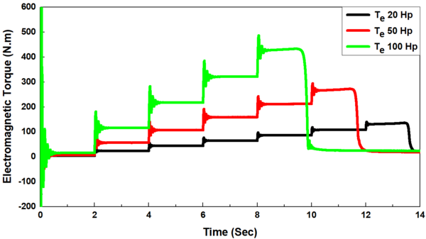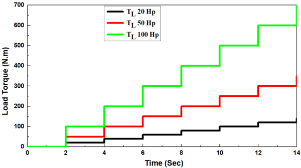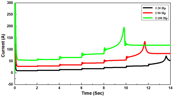 With different sized induction motors (20, 50, and 100 Hp), the synchronous generator was firstly connected direct-on-line with induction motor without load torque (TL=0) in the period (0-2 s) and the load torque was then suddenly applied in a step form in the periods 2-4, 4-6, 6-8, 8-10, 10-12, and 12-14 s, where the load torque ranged from 25% to 150 % of full load torque with a gradual increase of 25 %, respectively, Figure 5(a). The values of starting currents were obtained to be 163.35, 470.4, and 989 A, respectively for different sized induction motors of 20, 50, and 100 Hp, which increased by about 6 - 9 folds of full load current, and in some cases, it could attain 10 folds. The current drawn by induthe ction motor in the period of 0-2 s which was just after starting the period with no-load (TL=0) is known as the no-load current which represents about 40-50 % of full load currents of 9.72, 27.65, and 54.78 A, respectively.