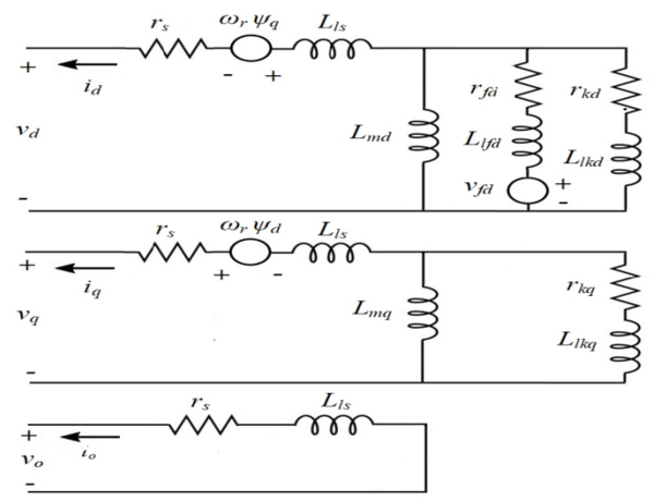 Where these mathematical equations represent the synchronous generator equivalent circuit in the rotor reference frame as illustrated in Fig. (1).