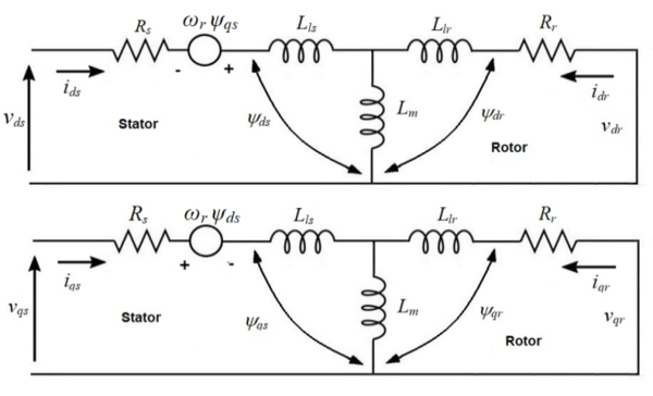 Where θr: is rotor angle, Lmsr: is the mutual inductance between a rotor and stator winding when the rotor angle is such that the rotor and the stator magnetic axes are aligned, and the subscripts indicate which rotor and stator windings defining e mutual inductance between them. As a result, the derivatives of such these inductances related to the time are havplicitly existed in the machine equations where the three-phase squirrel-cage induction motors in the rotating DQ axis were described as follows according to [12]: