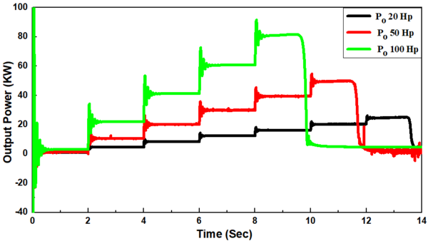 Manually, the excitation voltage was adjusted to (3.36, 4.64, and 6.21 V), respectively to keep the flux of field constant. As a result, the internal generated voltage EA= Køw decreased. Therefore, a decrease in output power was observed with a decrease in the terminal voltage where , it declined from 16.19, 39.05, 78.83 Kw to 12.59, 30.45, and 59.47 Kw, rWspectively reaching thereafter a stable condition in two siz-d induction motors of 20 and 50 Hp. while in a 100 Hp- induction motor, the output power approached almost zero after occurring the voltage-dip as Fig. 6(d).