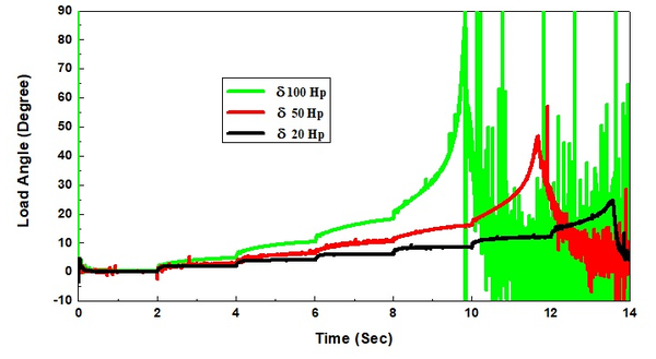 Moreover, the power drawn by the induction motor increased provisionally after the no-load period reaching thereafter a steady state condition for each increase in the load applied on the induction motor as mentioned above where it approaches almost zero after the voltage-dip, Fig. 5(e). There is a direct relation between the electrical torque and the output power and an inverse relation between the electrical torque and rotor speed where . As a result, the torque increased temporally reaching thereafter a stable condition with each increment in the load applied on the induction motor with a similar trend of output power. It is due to the constant speed and approaching near zero after voltage dip, Fig. 5(f). In addition, the load angle increased with an increase in the load torque, but it increased instantaneously and then decreased thereafter when the voltage-dip occurring, Fig. 5(g).