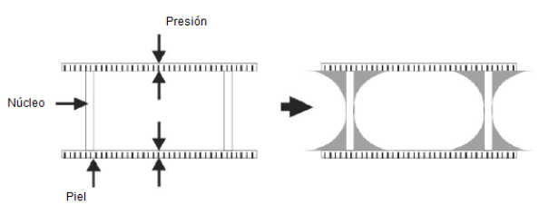Una curva de resina se forma en la interfase entre el laminado y las paredes de las celdillas del núcleo honeycomb a medida que la viscosidad desciende con el aumento de la temperatura que tiene lugar durante el proceso de curado. La resina experimenta un fenómeno de capilaridad formándose un menisco entre la piel y la celdilla del núcleo “honeycomb”. La resina cura en esta forma originándose un arco o curva denominado menisco.