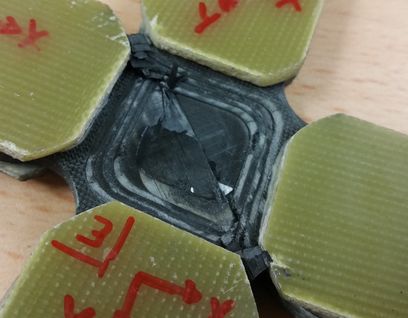 En lo que respecta a las campañas de ensayos experimentales, para mantener la consistencia de los resultados, todos los ensayos cuasiestáticos realizados en esta tesis se llevan a cabo empleando una máquina triaxial electromecánica MICROTEST MAEFH (Figura 1). Este equipo singular dispone de seis actuadores sincronizados en un búcle cerrado, y se encuentran equipados con mordazas de agarre neumáticas. Cada actuador es accionado por un motor eléctrico independiente, permitiendo la aplicación controlada de carga hasta 50 kN por actuador. Se efectúan ensayos de tracción y compresión uniaxial, tanto sobre laminados habituales para caracterización de propiedades en direcciones principales de la lámina (laminados unidireccionales a 0º y 90º), laminados con secuencias de interés (principalmente angle-ply con diferentes ángulos de fibra), así como ensayos a flexión. No obstante, los ensayos más destacables son los biaxiales sobre probetas cruciformes, trabajando con diferentes secuencias cross-ply y angle-ply ante diferentes ratios de carga. Cabe indicar que la notación empleada para estos ensayos se definirá en adelante por el sentido de las cargas aplicadas en las dos direcciones, bien tracción (T) o compresión (C), y el ratio entre las fuerzas aplicadas en estas dos direcciones. Por ejemplo, T-T 2/1 implicaría cargas de tracción en ambos ejes, siendo de doble magnitud en uno de ellos. Estos ensayos carecen de una normativa específica (salvo en el caso particular de metales [23]), por lo que la geometría de probeta y las condiciones de ensayo son tomadas de estudios previos [12-15]. Sin embargo, los ensayos T/T y C/C presentan el inconveniente de la aparición de concentraciones de tensiones fuera de la zona de medición del estado biaxial, induciendo un fallo temprano e invalidando, en ocasiones, el valor de resistencia biaxial obtenido, si bien el trabajo mostrado se centra en el estudio de la respuesta previa al fallo.