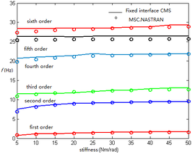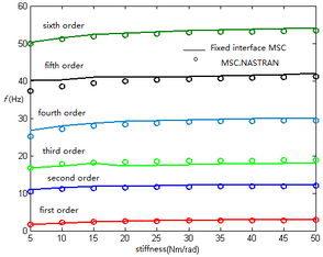 It can be seen from Figure 6 that with the increase of stiffness, the frequency basically increases. Even if the stiffness changes in a relatively large range, the fixed interface component modal synthesis can be used to well simulate the dynamic characteristics of the structure. When the connection position 1 is elastic connection, the mode shapes by the main mode combination of (6,8,10) are compared those by MSC.NASTRAN, as shown in Figure 6.