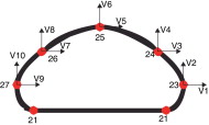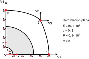 La superficie externa de la sección está dada por un spline cúbico definido por 3 puntos. Sobre la superficie circular interna se aplica una presión P . Como se muestra en la figura 7 , se han considerado 2 condiciones de simetría para definir el modelo.