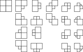 En el proceso de refinamiento h -adaptativo de la malla, entre 2 elementos adyacentes se permite una diferencia máxima de un nivel de refinamiento. Teniendo esto en cuenta, junto con las características topológicas de las mallas, es fácil comprobar que aparecerá un número reducido de configuraciones de patches internos. En la figura 6 se muestran las 19 posibles configuraciones de patches internos para un problema de 2 dimensiones.