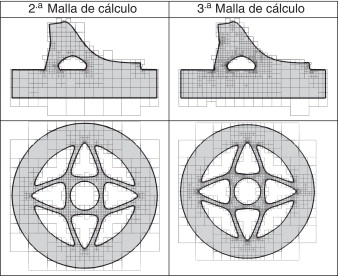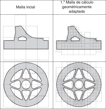 El proceso de análisis comienza adaptando las dimensiones de una malla cartesiana al dominio que se va a analizar, de manera que este quede embebido dentro de la malla. Esta malla cartesiana será una de las de la batería de mallas, del nivel especificado por el usuario. Posteriormente, la malla se interseca con el dominio del componente que se va a analizar. Para generar la primera malla de análisis se ejecuta un primer paso de refinamiento basado en la geometría del componente. En este paso se procede a refinar los elementos de contorno dentro de los cuales el indicador de curvatura del contorno, definido por la expresión (8) , sea excesivo. El proceso de refinamiento se continúa repitiendo hasta que en todos los elementos de contorno el indicador de curvatura relativa sea suficientemente bajo, generándose así la primera malla de cálculo, como se puede ver en los ejemplos de la tabla 1