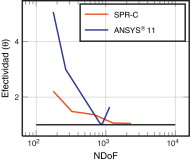 Figura 11. Cilindro sometido a presión interna. Q8. Evolución de la efectividad global del estimador del error (θ ) con el número de grados de libertad para el solver ANSYS® 11 y para la técnica SPR-C. La línea negra indica la unidad. |