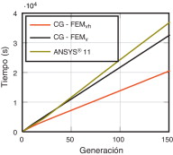 Figura 10. Comparación de tiempos de cálculo del proceso de optimización utilizando: ANSYS® 11, código de CG-FEM compartiendo verticalmente la información de intersecciones (curva ) y compartiendo también horizontalmente esta información (curva CG − FEMvh ). |