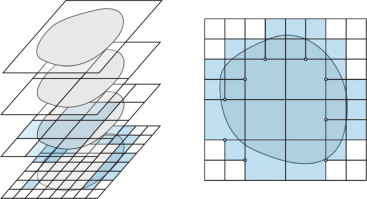 Las mallas cartesianas permiten reutilizar fácilmente información previamente calculada. En este apartado se expondrá, en particular, la reutilización de información asociada a la evaluación de la matriz de rigidez: a) de elementos del interior del dominio, y b) de elementos del contorno entre distintas geometrías.