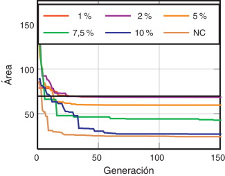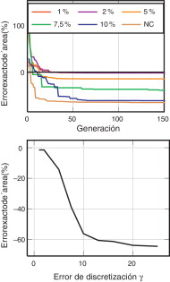 En la figura 8 se muestra la evolución del área con el número de generaciones para los diversos análisis, siendo la línea negra el valor óptimo analítico. En la figura se observa que el área obtenida de los análisis tiende al área óptima a medida que se imponen valores más pequeños de γ .