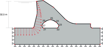 Para el proceso de optimización se han utilizado 100 generaciones y 30 individuos por generación. Las variables de diseño corresponden a las coordenadas (x , y ) de los puntos 23 al 27 del agujero interno ( fig. 13 ). Para el hormigón se ha considerado un módulo de Young , un coeficiente de Poisson μ = 0,25 y un límite de fluencia . La densidad del agua se ha tomado de y la del hormigón de .