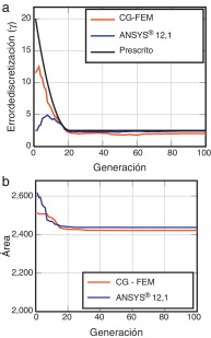 Este problema se ha resuelto utilizando tanto ANSYS® 12.1 como el código CG-FEM propuesto en este artículo, con un error de discretización prescrito (γ ) variable, desde un valor inicial de 20% hasta un valor de 2,5% en 20 iteraciones, tal y como muestra la figura 14 a, a fin de reducir el coste computacional en las primeras etapas de la optimización tal como se describe, por ejemplo, en [29] . Se observa que en la figura ambos solvers son capaces de conseguir un error global menor que el prescrito.