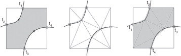 donde Ωe es el dominio del elemento, nste es el número de subdominios de integración triangulares en el elemento e , situados en el interior del dominio del problema, y es cada uno de estos subdominios de integración. Los dominios triangulares de integración pueden considerarse de tramos rectos si en la interpolación de desplazamientos se utilizan elementos lineales. Sin embargo, si se usan elementos cuadráticos es necesario tener al menos una aproximación cuadrática al contorno. Alternativamente, se pueden utilizar técnicas de mapping transfinito, habitualmente usadas en el contexto de refinamientos p -adaptativos [38] and [45] , que permiten considerar la geometría exacta en el proceso de integración. La utilización del mapping transfinito para representar la geometría supone un aumento del coste computacional por subdominio de integración pero reduce al máximo el número total de subdominios. Los resultados presentados en este trabajo consideran una aproximación a la geometría del mismo orden que la interpolación de elementos finitos, dejando el uso del mapping transfinito para problemas que requieran una mayor precisión.