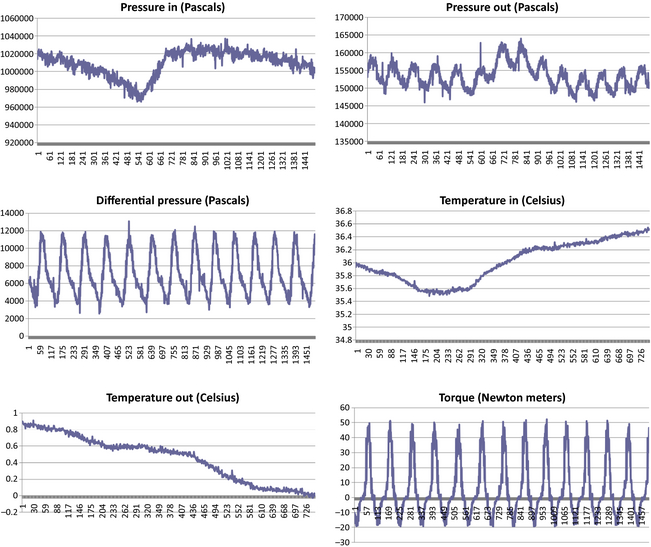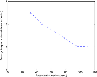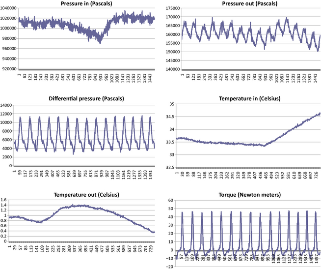 Whatever the cause, the oscillating torque periodically saturates the sensor at its maximum value as can be seen in Figure 14. For this reason, the last two data run at the highest rotational speeds tested, had excessive torque sensor saturation and were not reported in the efficiency analysis.