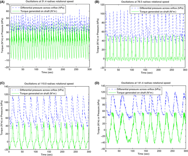As mentioned in the last section, the torque measurement on the shaft between the expander and VFD shows large, unexplained, periodic oscillations that varied inversely with rotational speed as seen in Figure 13. Figure 14 A–D shows the 300 sec oscillating differential pressure (across the orifice plate) and torque data at several rotational speeds. Note that these speeds are set points of the VFD and all reported measurements in the derived data incorporate the potential error inherent in controlling and measuring this speed. Mass flow rate is proportional to differential pressure, therefore, the orifice plate flow meter data corroborate the oscillating torque data as a real effect. Note that the torque oscillates so greatly that the expander goes from generating power to absorbing power over the course of one period of oscillation. The full data can be found in Appendix A.