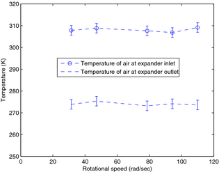Figure 9. Temperature of air at expander inlet and outlet (error bars indicate combined total accuracy). |
