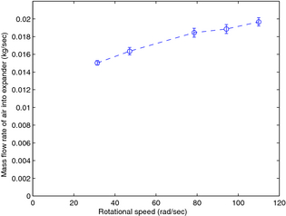 Figure 8. Mass flow rate of air through expander (error bars indicate one standard deviation). |