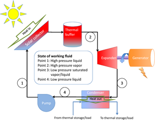 The envisioned application for which this technology was evaluated is shown in Figure 1: a solar CHP system that uses a Rankine cycle. In this cycle, water (or another working fluid) is pumped to high pressure (1000 kPa), heated in a concentrating solar collector to greater than 473 K, then expanded producing work on a shaft which is attached to a generator. The cooled fluid exits the expander and is condensed back to its original state. Ideally, the cold reservoir, to which the working fluid dumps energy, is some useful thermal load, hence completing the combined heat and power Rankine cycle.
