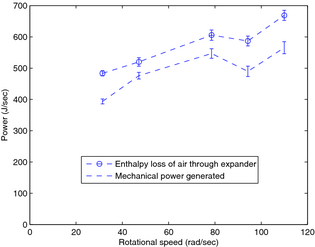 Figure 11. Enthalpy loss of air through expander, and mechanical power generated (error bars indicate total combined accuracy). |