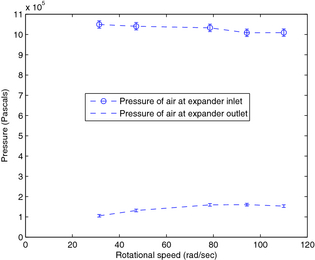 Figure 10. Pressure of air at expander inlet and outlet (error bars indicate combined total accuracy). |