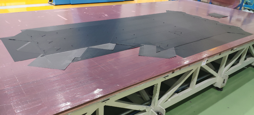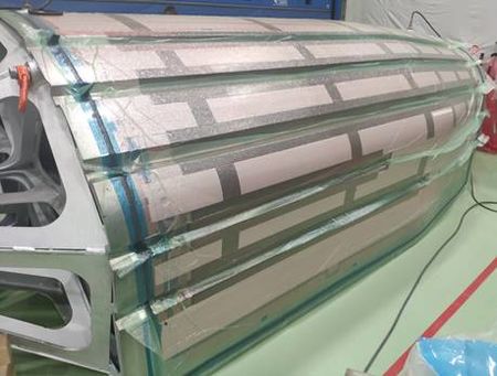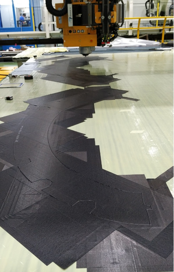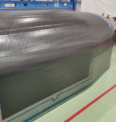 A continuación, se realiza el encintado de la piel con fibra de carbono preimpregnada en resina epoxi mediante una máquina de laminación automática AFP de formato de material 6.4mm.