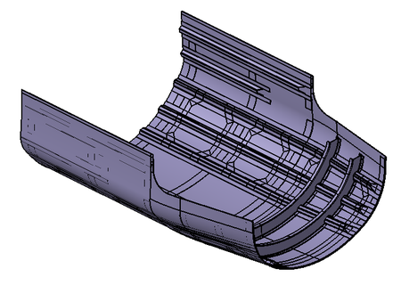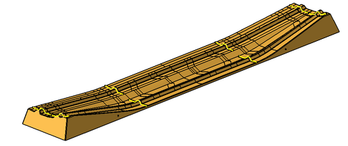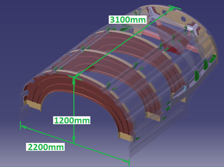 El útil se ha diseñado para laminar la piel de forma automática mediante una máquina AFP (Automatic Fiber Placement) El diseño permite integrar los rigidizadores en sección de Ω y las cuaderrnas de forma en sección en J, para poder realizar el cocurado en autoclave de todo el conjunto (piel, rigidizadores y cuadernas de forma)